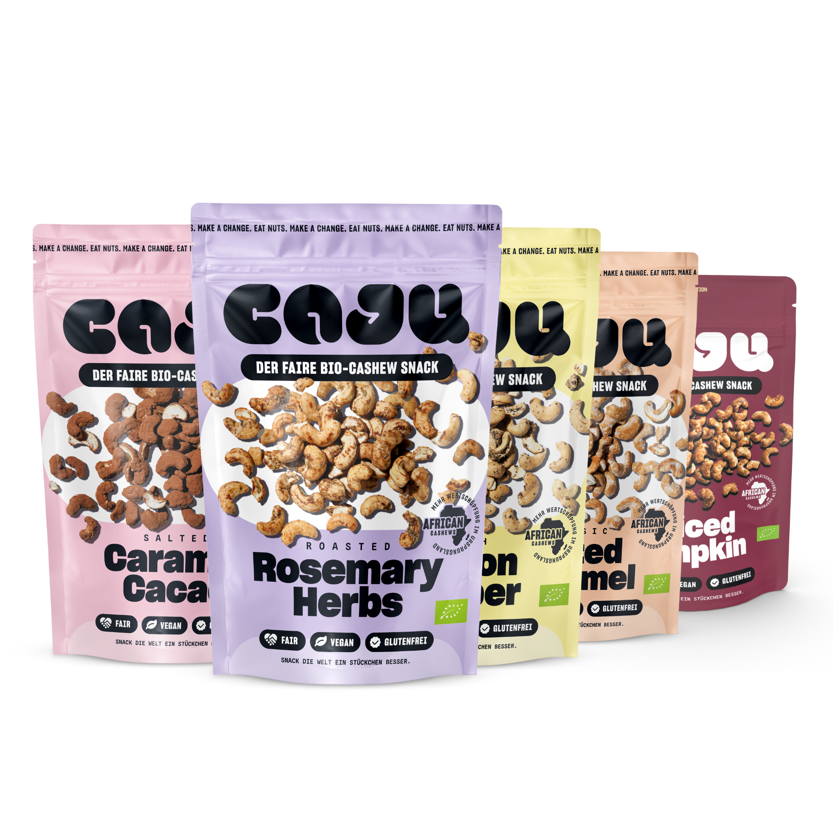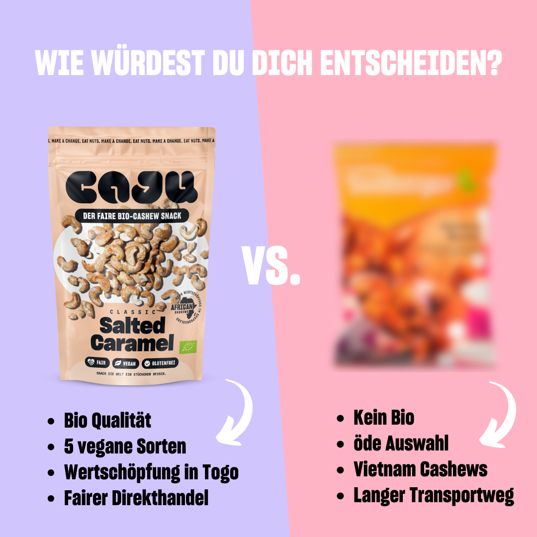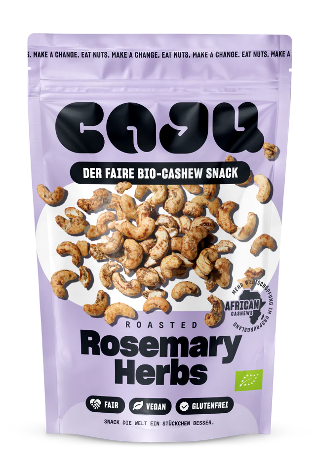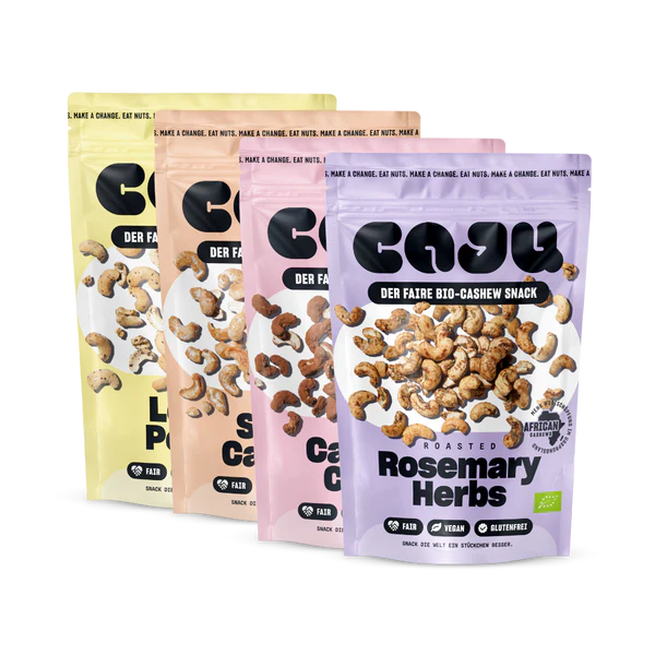 All caju products are made from natural organic ingredients, are gluten-free and save 90% CO2 compared to the Asia route during transport. Delicious snack and a win-win situation for everyone, not only for our planet, but also for the people at the beginning of the supply chain.